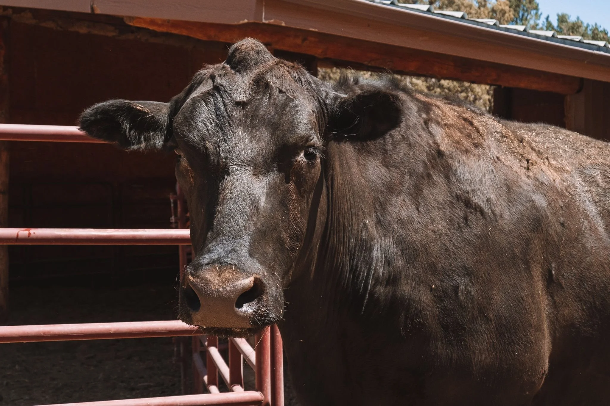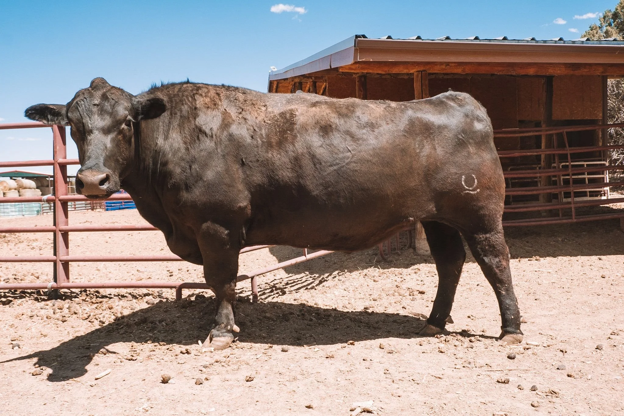 Coal is a steer who was born the third week of January 2011, just before the death-freeze in February plunged the temperature to 30 degrees below zero. Jeff feared he would loose the little calf and did everything in his power to keep him warm and well against the bitter cold. The record-breaking freeze was tough on all the animals so Jeff fed hourly to keep them internally warm. Coal is a Brangus/Santa Gertrudis cross and is one of the largest cows on the ranch.